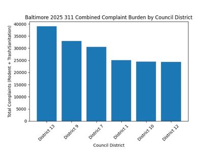 Baltimore’s 311 data show persistent clustering of rodent and trash overflow complaints in specific council districts, particularly Districts 13, 9, and 7. Rather than treating these complaints as isolated incidents, the City should respond with a targeted sanitation capacity adjustment in the highest-burden areas. While increasing trash collection to multiple times per week could further reduce overflow and rodent access, the labor and operational costs of such an expansion may make it less immediately feasible citywide. We recommend an automatic second city-issued trash receptacle for households in the top complaint districts to better align service capacity with neighborhood conditions. This approach shifts Baltimore from reactive rodent control toward preventive infrastructure solutions. By using complaint data to guide service expansion, the City can reduce repeat 311 requests, lower abatement pressures, and improve block-level cleanliness. A phased rollout beginning in the highest-burden districts offers a practical and fiscally responsible path forward.
